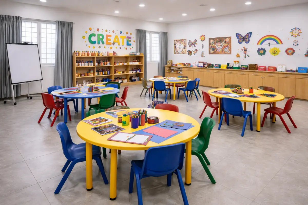 A flexible room used for art workshops, group projects, hobby clubs, and indoor activities. The space adapts to what students need on any given day, from craft sessions for younger children to project work for senior students. Not every learning moment happens at a desk, and this room gives students the space to collaborate, create, and experiment.